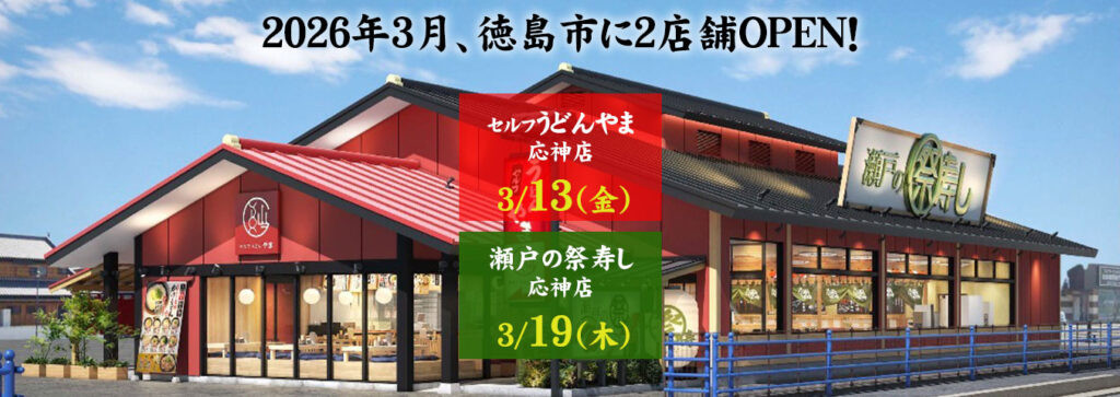 セルフうどんやま脇町店は3月13日~、瀬戸の祭寿し脇町店は3月19日~オープンし、